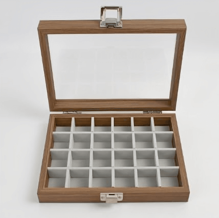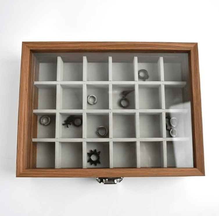 Keep your jewelry organized and stylishly displayed with the SUNGLASSES MART Wooden Jewelry Box. Designed with a clear glass lid, soft velvet interior, and secure locking system, this 24-grid box is the perfect solution for keeping your rings and earrings safe, visible, and neatly stored.